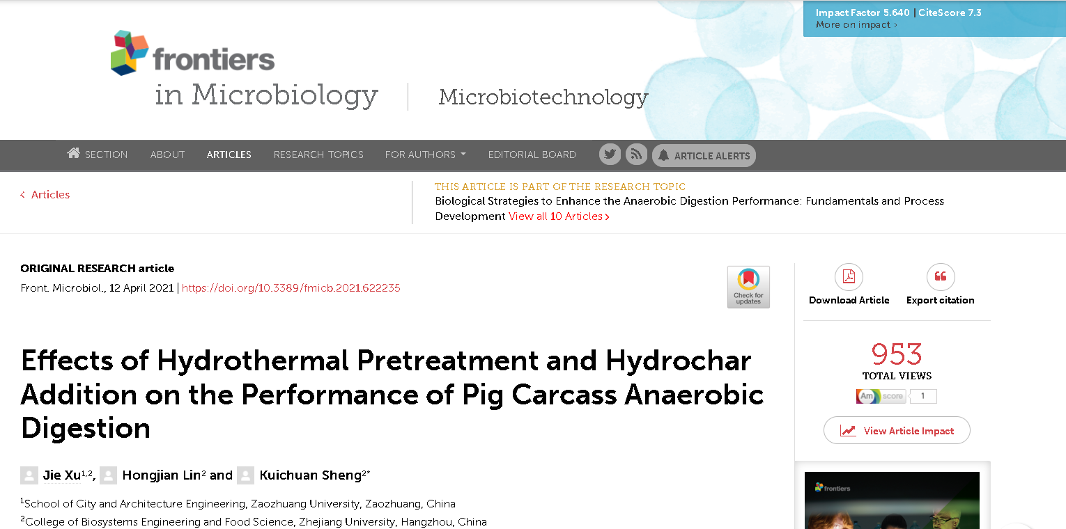 近日,WilliamHill中文官网固废资源化综合利用科研小组在水热炭调控厌氧消化研究方面取得最新进展,相关工作发表在国际著名期刊《Frontiers in Microbiology》(中科院一区,TOP期刊,影响因子5.640)上,论文题目为《Effects of hydrothermal pretreatment and hydrochar addition on the performance of pig carcass anaerobic digestion》,威廉希尔WilliamHill为第一单位,徐杰博士为论文第一作者。
