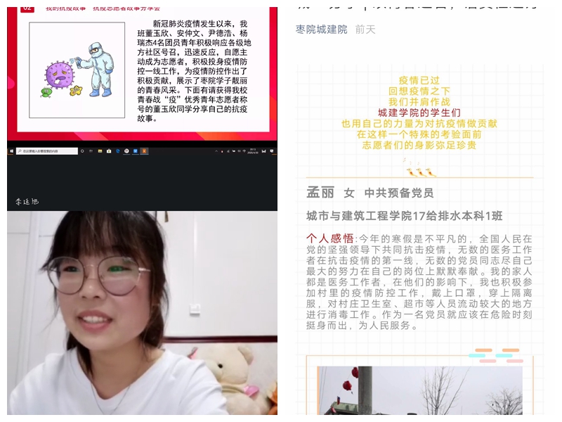 为确保全面准确做到“五个讲清楚”,保证思想引领作用落到实处,引导青年员工进一步坚定制度自信,团总支副书记杜珊珊利用钉钉为公司员工会干部、各班团支部书记围绕抗疫成就与制度优势开展网上团课;在认真完成青年大学习集中学习的基础上,又结合公司工作实际与专业倾向,各团支部书记组织召开网上主题团日活动;各团支部在五四评优中获得“优秀团干”称号、被评为青春战“疫”优秀青年志愿者的同学也通过钉钉或QQ群开展宣讲报告、故事分享等学习宣传活动,向大家分享自己的心得;利用“枣院城建院”微信公众平台,开展网络知识竞赛,以此夯实同学们思想基础建设,提升理论学习的思想性、亲和力和渗透度;向全体同学发出倡议“呼吁同学们加入到志愿者的行列中来,持续深入开展疫情防控志愿服务工作”,在做好自身安全防护的前提下,依法科学有序参与疫情联防联控,为坚决遏制疫情扩散、夺取防控斗争胜利贡献青春力量;结合疫情防控实际推荐优秀抗疫志愿者作为入党积极分子候选人。
