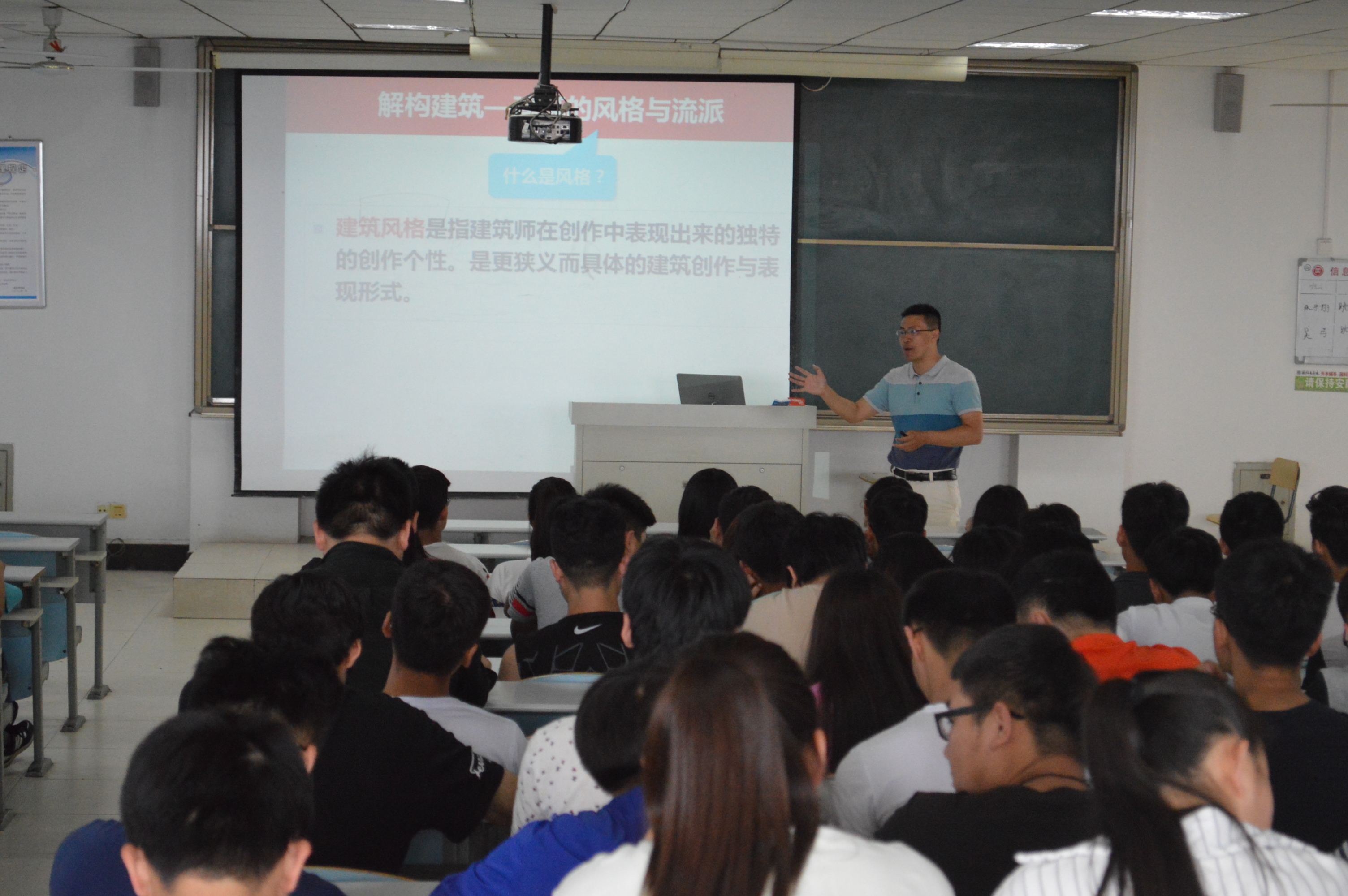 报告会上,孙法印老师首先通过播放图片及视频,为同学们简单介绍了世界各地风格迥异的建筑风格与流派。随后,孙老师按照历史的进程,并结合在南京实习所见所闻,详细地为同学们介绍了从古代建筑开始我国的主流建筑风格,结合幻灯片上的图片,为同学讲解了各个时期主要建筑风格的特点与主要形式。从文化的视角上,结合当时的历史特点,让同学们了解该时期此种建筑风格的形成原因。孙法印老师的报告深入浅出,赢得同学们的阵阵掌声。