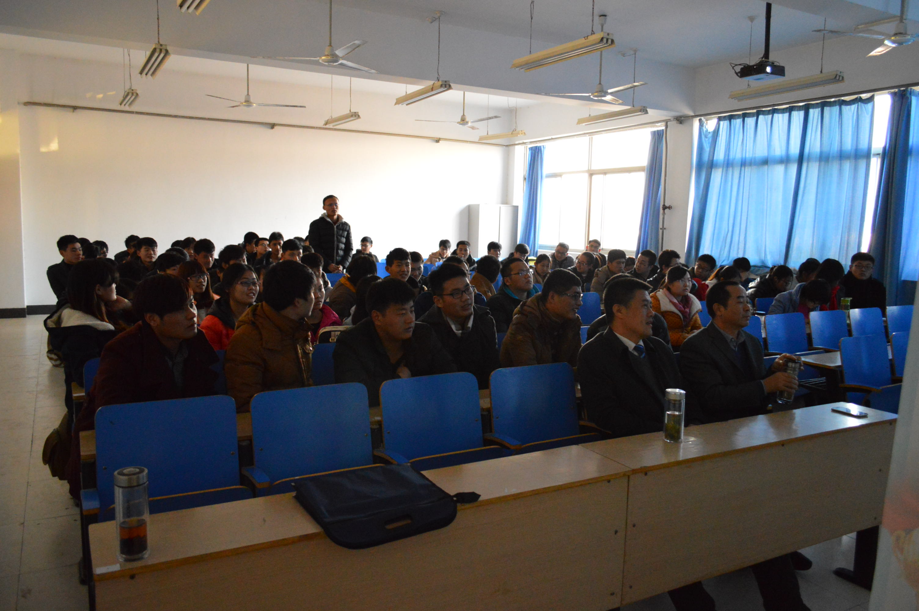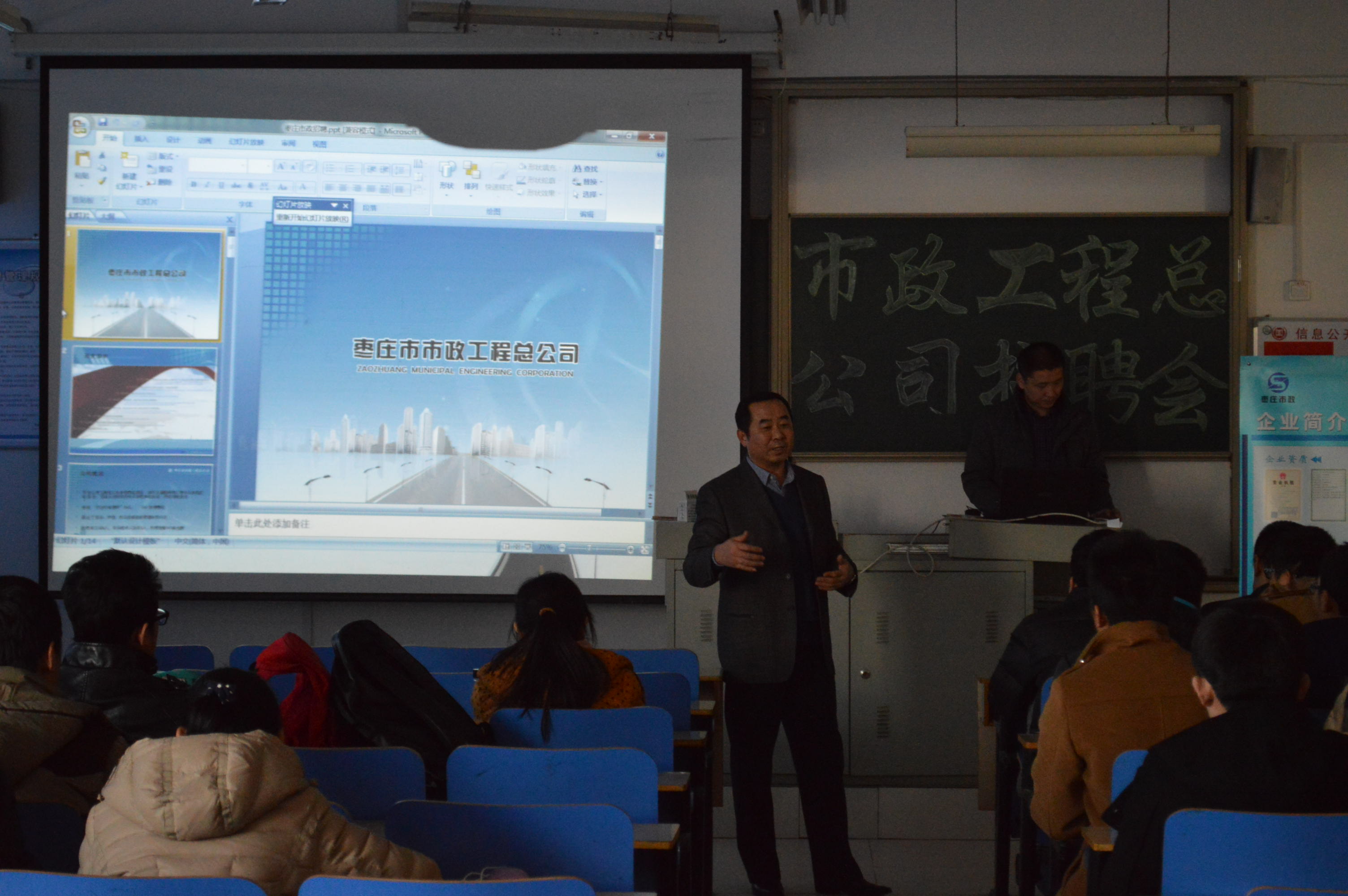 招聘会伊始,市政工程公司的工作人员通过播放视频和幻灯片的形式,为同学们详细的介绍枣庄市政工程公司的基本情况,包括公司的基本规模,管理模式,工资待遇以及发展前景。然后招聘会进入了现场答辩环节,针对大部分同学比较关心的员工的工作待遇,实习工作的时间,工作的假期安排等问题,相关的工作人员进行了细致的解答,解决了同学们的后顾之忧。招聘会最后,同学们填写了意向书,并与工作人员进行了交流。