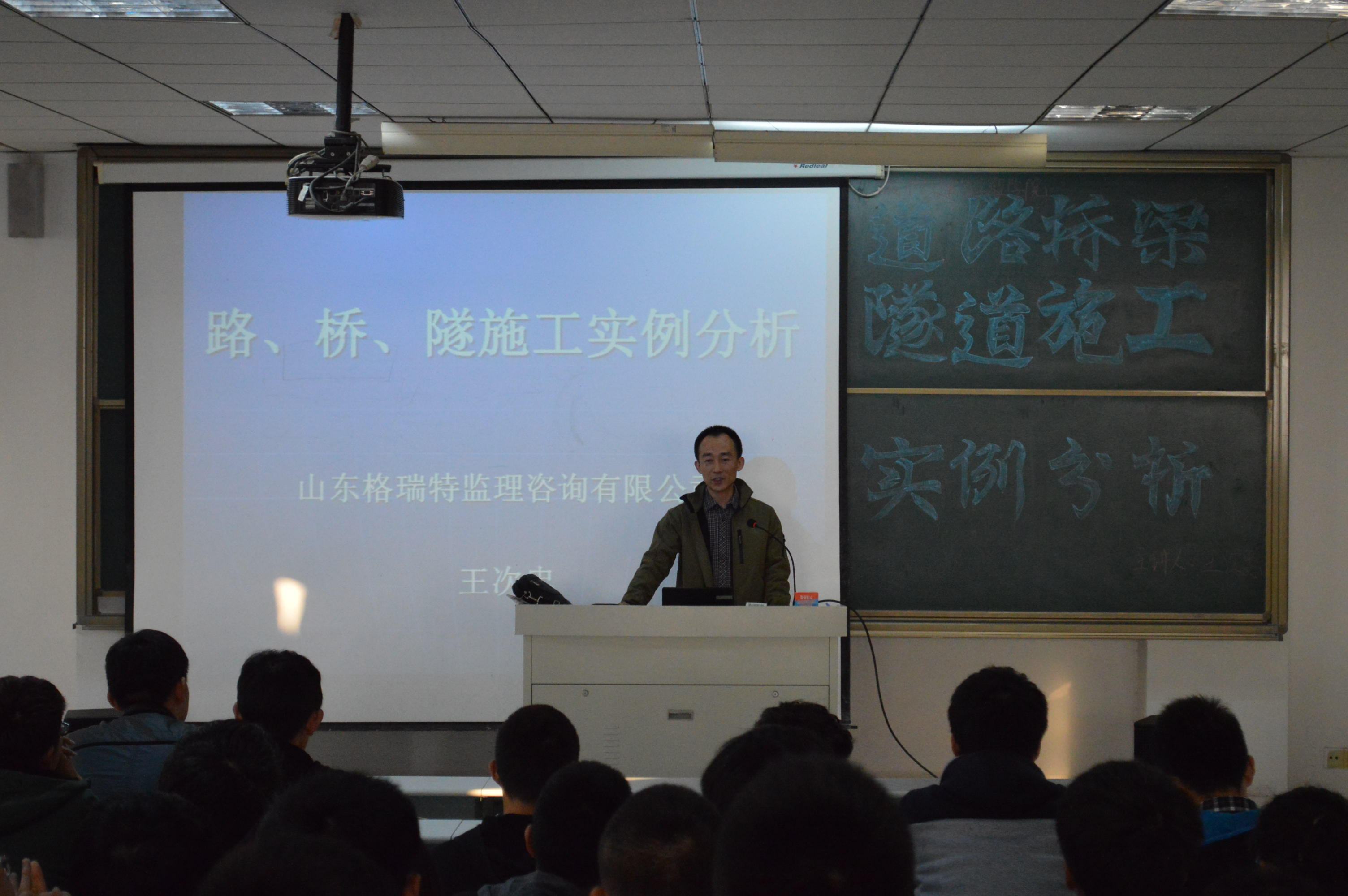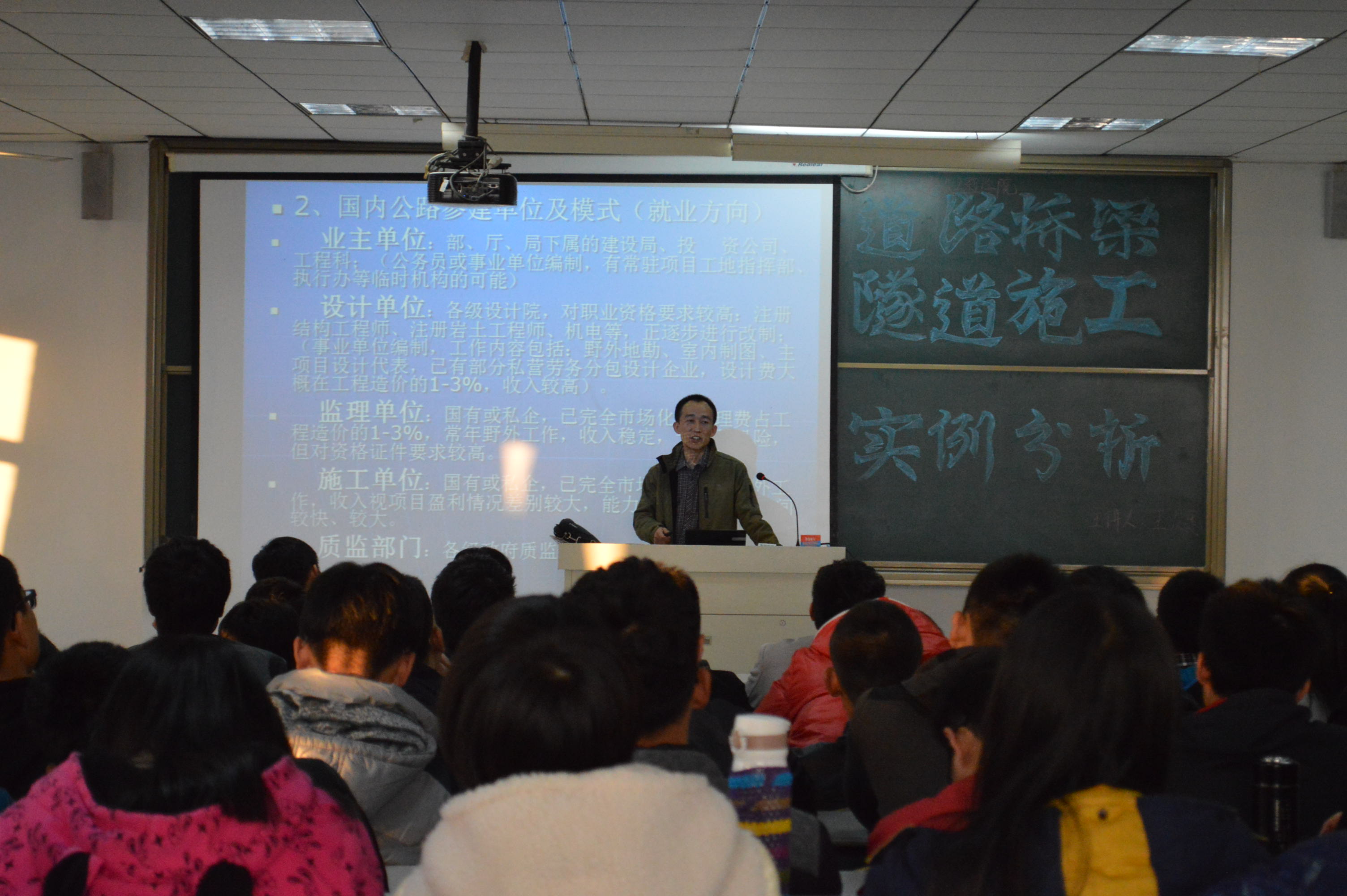 会前,城建公司负责人为王次忠颁发了校外实习指导老师聘书。随后,王次忠通过PPT演示和播放视频,为同学们介绍了国内的公路工程概况、公路工程的几种典型结构:路基、路面、桥梁、涵洞,隧道等。他又从本人参与的实体项目中作经验分析,介绍了国内公路参建单位及模式。包括业主单位、设计单位、监理单位、施工单位,质监部门等,以及相关的就业方向,加深了同学们的对公路工程结构的认识。最后,王次忠为同学们在校期间应该重点关注的专业课程做了介绍,勉励同学们刻苦钻研、勤奋学习,在校内就要打下坚实的理论基础。报告深入浅出,精彩纷呈,博得了全场师生的热烈掌声。