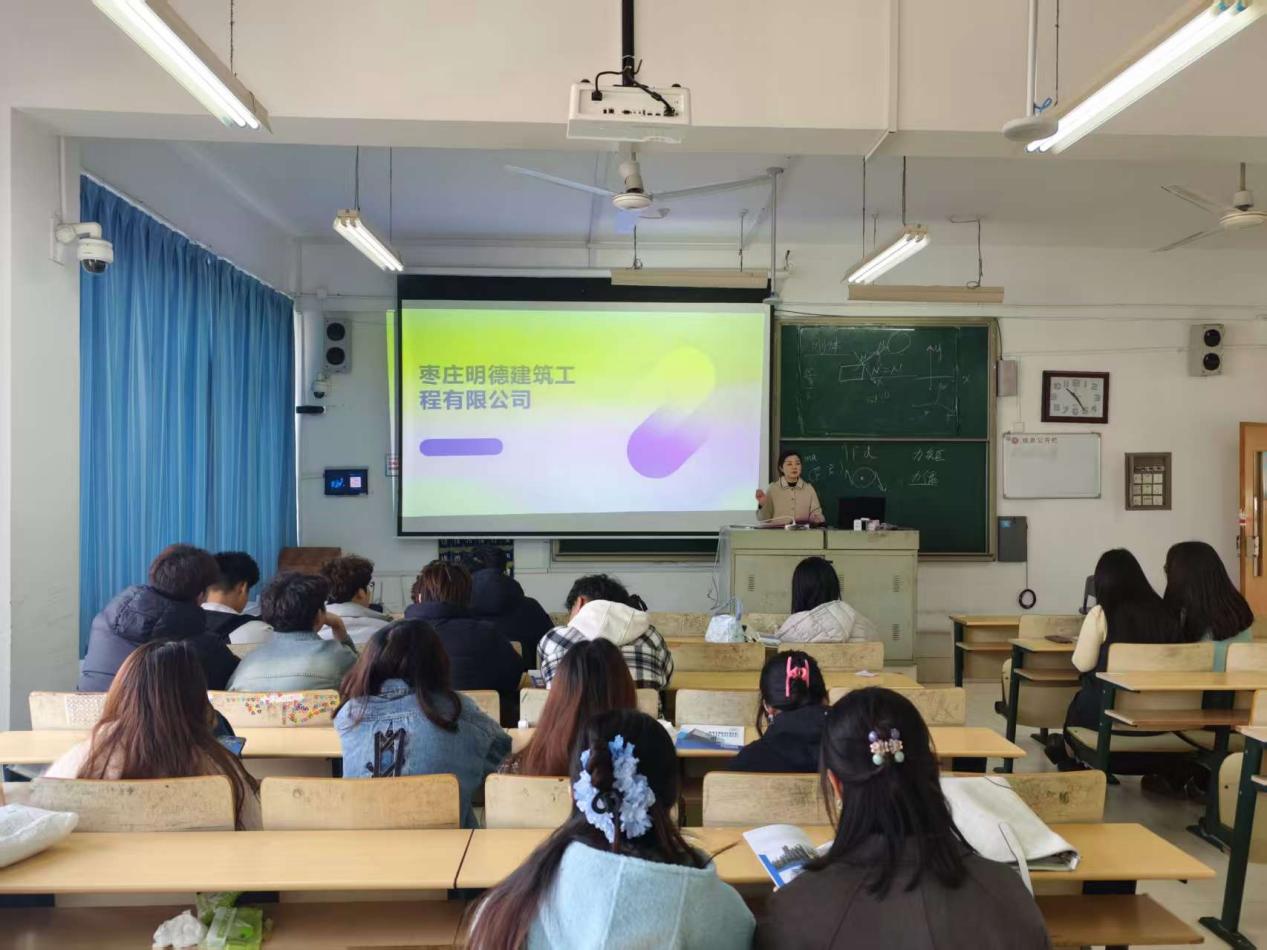 为精准对接建筑行业优质人才需求,助力2026届毕业生拓宽就业渠道、明晰职业方向,3月21日上午10点,公司邀请枣庄明德建筑工程有限公司在理工楼2318举办专场宣讲会。公司就业工作负责人、部分毕业生代表共同参与此次活动。