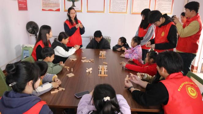 绘画结束后,志愿者们将鲁班锁与雷锋精神相结合,讲解并指导孩子们拆解、组装鲁班锁,教导孩子们学习雷锋不怕困难、勇于探索的精神。