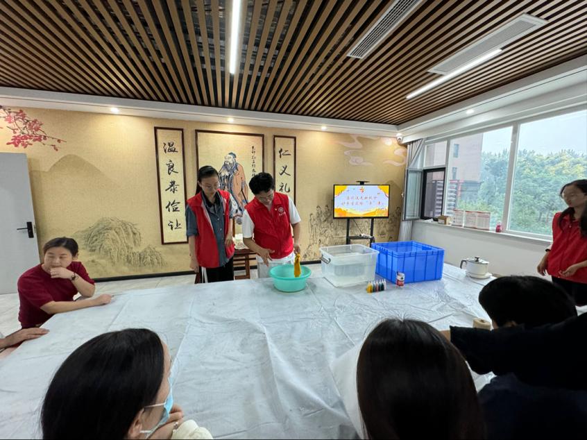 活动伊始,青年志愿者通过精心准备的讲解和视频,向居民们介绍了扎染这项古老染色技艺的悠久历史与文化内涵。从西南少数民族的传统工艺到国家级非物质文化遗产,队员们生动讲述了扎染的图案寓意和工艺美学,让在场居民对“布上的青花瓷”有了初步的认识和浓厚的兴趣。