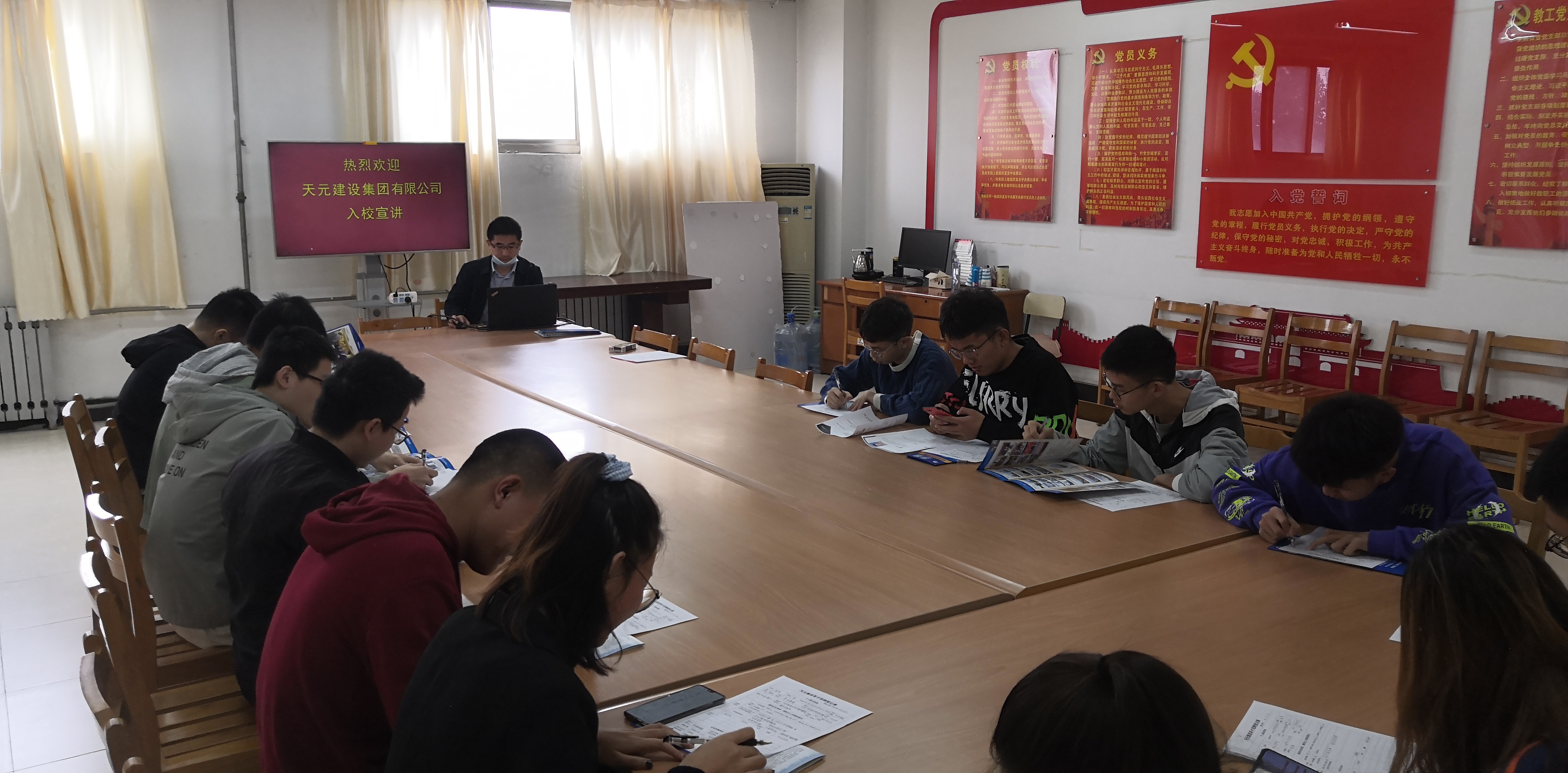 招聘会上,山东天元集团通过播放宣传片、PPT展示、面对面交流等方式向同学们介绍关于我们、职业的发展方向、人员需求以及选择该单位的理由等。